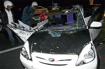 Empat maut termasuk sepasang suami isteri dalam kemalangan membabitkan empat kenderaan, dipercayai berpunca daripada kegagalan brek berfungsi salah sebuah kereta, dalam kejadian di Lebuhraya Lingkaran Tengah 2 (MRR2), di sini, petang semalam. Dalam kejadian jam 5.30 petang membabitkan tiga kereta dan sebuah motosikal itu menyebabkan pemandu dan tiga penumpang kereta PERODUA Viva maut serta-merta di lokasi kejadian, manakala sekurang-kurangnya tiga cedera. Mangsa maut dikenal pasti sebagai pemandu PERODUA Viva, Hasbullah Abdul Ghani, 26; dan isterinya, Nurul Intan Syahida, 22, yang duduk di bahagian penumpang depan, yang putus kepala akibat terkena kabel penghadang jalan.