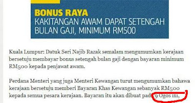 entri dikemaskini salah faham berita bonus hari raya 2013 kakitangan awam16 Julai 2013, jam 10 malam – Menurut laporan media, Cuepacs pada Selasa menggesa kerajaan agar mempertimbangkan pemberian bonus setengah bulan gaji kepada 1.4 juta penjawat awam di negara ini dan menganggap pemberian bonus tersebut adalah satu keperluan menjelang sambutan Hari Raya Aidilfitri, bulan depan
